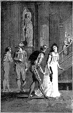 据记载,公爵抢先回府,吩咐家人怎样接待堂吉诃德。堂吉诃德随公爵夫人刚到门口,里面就出来两名小厮,都披着齐脚面长的深红缎袍,像起床穿的便服。他们把堂吉诃德抱下马,悄悄在他耳里说:
