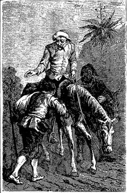 当夜主仆俩在旷野露宿一宵,第二天又上路。忽见一人迎面步行而来,脖子上挂着个褡裢口袋,手里拿着一支标枪或短矛,恰像个步行的信差。这个人走近堂吉诃德,跑着快步抢上来,抱住他右腿——因为这人站在平地上,比骑马的矮着一截;他满面堆笑,说道: